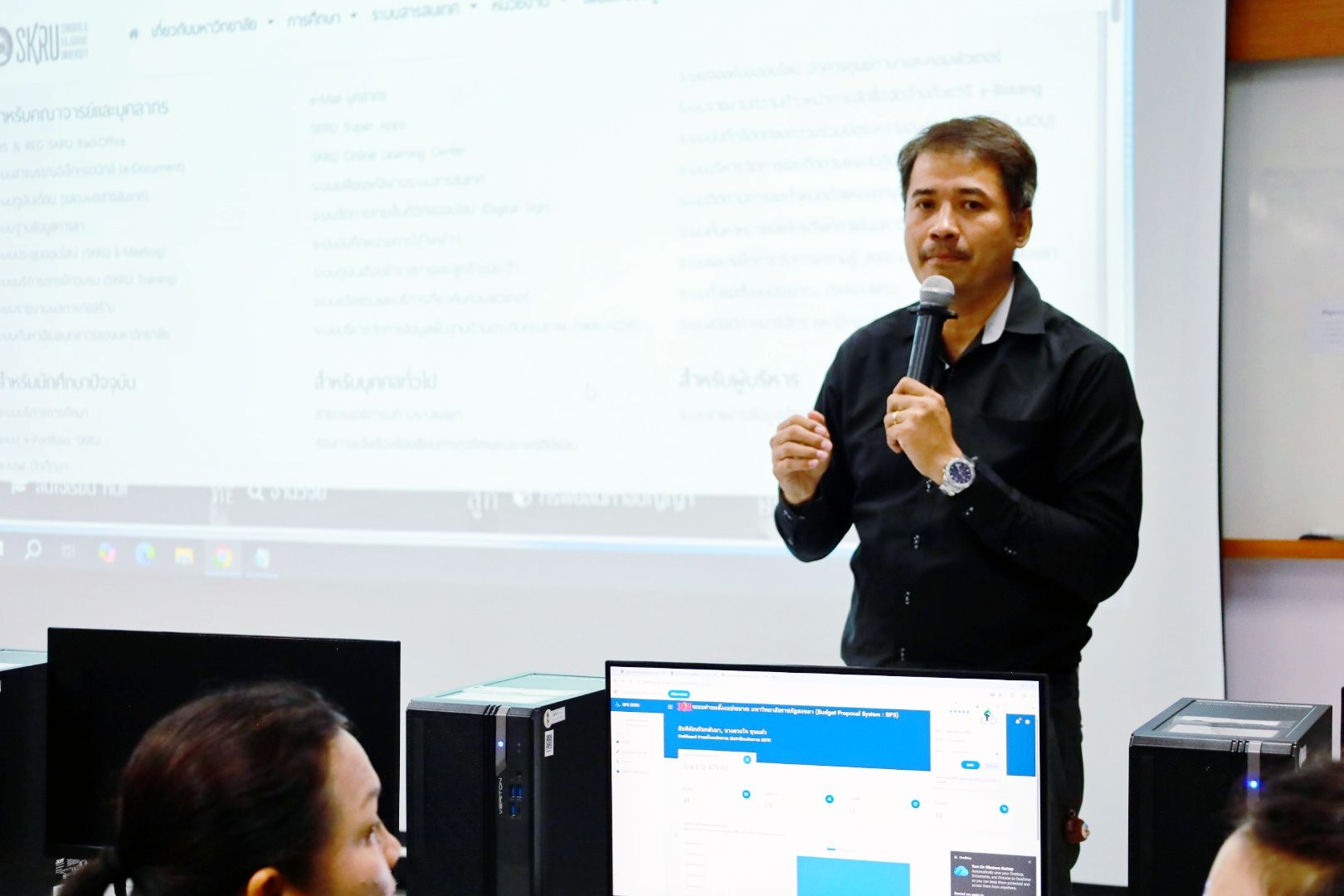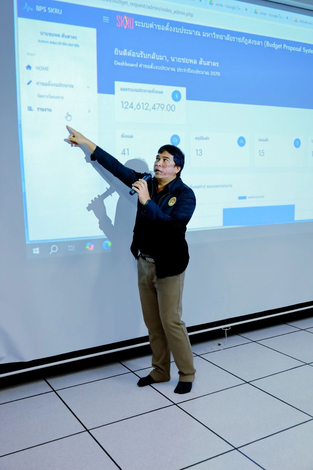 โดยมีผู้ช่วยศาสตราจารย์วุฒิชัย อินทร์แก้วรองผู้อำนวยการ กล่าวในกิจกรรมครั้งนี้ว่า จากการศึกษาร่วมกับทีมทำงานพัฒนาระบบ คิดพัฒนาระบบขึ้นมาเพื่อช่วยลดกระบวนการทำงาน เพิ่มประสิทธิภาพให้สะดวก รวดเร็วมากยิ่งขึ้น สามารถตรวจสอบผ่านระบบได้โดยง่าย และยังมีส่วนช่วยลดปริมาณการใช้กระดาษ ประหยัดทรัพยากร ตอบโจทย์กับการพัฒนาระบบที่เป็นมิตรต่อสิ่งแวดล้อม สอดรับกับการเป็นสำนักงานสีเขียว และมหาวิทยาลัยสีเขียว Green University SKRU ราชภัฏสงขลารักษ์โลก อีกด้วย นอกจากนี้ยังได้ให้เกียรติเป็นวิทยากรร่วมกับทีมศูนย์คอมพิวเตอร์ ในการแนะนำวิธีการใช้งานระบบคำของบประมาณรายจ่าย และระบบติดตามยานพาหนะ ผู้ร่วมเป็นวิทยากรประกอบด้วย นายสมศักดิ์ เหลาะเหมนายชยพล สันสาคร นายกอบศักดิ์ ณ นคร และ นางเพ็ญประภา ยีเจ๊ะ นักวิชาการคอมพิวเตอร์ จากศูนย์คอมพิวเตอร์