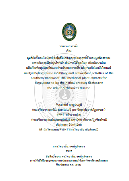 ฤทธิ์ยับยั้งเอนไซม์อะซิติลโคลีนเอสเตอเรสและฤทธิ์ต้านอนุมูลอิสระของ สารสกัดจากพืชสมุนไพรท้องถิ่นภาคใต้ของไทย เพื่อพัฒนาเป็น ผลิตภัณฑ์สมุนไพรต้นแบบสําหรับลดภาวะเสี่ยงต่อการเกิดโรคอัลไซเมอร์