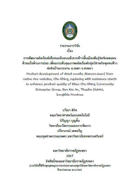 การพัฒนาผลิตภัณฑ์เส้นขนมจีนอบแห้งจากข้าวพื้นเมืองพันธุ์ช่อขิงทดแทน ด้วยแป้งต้านการย่อย เพื่อยกระดับคุณภาพผลิตภัณฑ์กลุ่มวิสาหกิจชุมชนข้าว