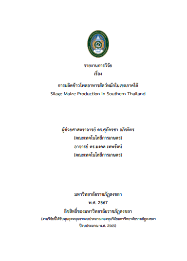 การวิจัยครั้งนี้มีวัตถุประสงค์เพื่อศึกษาพันธุ์ข้าวโพดเลี้ยงสัตว์ที่เหมาะสมต่อพื้นที่ปลูกในภาคใต้ และคุณค่าทางโภชนะของข้าวโพดอาหารสัตว์ที่ปลูกทดสอบในพื้นที่แปลงปลูกพืชของเกษตรกร ตำบลทุ่งลาน อำเภอคลองหอยโข่ง จังหวัดสงขลา โดยการวิจัยแบบผสานวิธี จากนั้นนำข้อมูลที่ได้มาวิเคราะห์ พบว่า ทั้งแปลงเกษตรกรและแปลงสถานีปฏิบัติการพืชไร่ มีเนื้อดินค่อนข้างหยาบ มีค่า pH เป็นกรดถึงเป็นกลาง มีค่าการนำไฟฟ้าในเกณฑ์ปกติ ไม่มีปัญหาการสะสมเกลือ และมีปริมาณอินทรียวัตถุอยู่ในระดับปานกลางค่อนข้างต่ำ จากการทดลองพันธุ์ข้าวโพดเลี้ยงสัตว์จำนวน 4 สายพันธุ์ ได้แก่ นครสวรรค์ 4, นครสวรรค์ 5, ซี.พี. 303 และ ซี.พี. M26 พบว่า ข้าวโพดเลี้ยงสัตว์แต่ละสายพันธุ์มีลักษณะตรงตามสายพันธุ์ทั้งความสูงต้น ความกว้างโคนต้น วันออกดอกตัวผู้และวันออกไหม แต่พบว่ามีการผสมเกสรและสร้างเมล็ดน้อยลง ทั้งนี้อาจเนื่องจากสภาพภูมิอากาศในช่วงระหว่างการทดลองมีความแปรปรวน (ภาวะแล้ง) (เดือนกุมภาพันธ์ ถึง เดือนเมษายน 2567) อากาศร้อน แล้งมากกว่าปกติ ส่งผลให้ข้าวโพดมีอัตราการคายน้ำสูงกว่าปกติ ส่งผลต่อผลผลิตต้นสดของข้าวโพดเลี้ยงสัตว์ แต่ข้าวโพดเลี้ยงสัตว์ทั้ง 4 สายพันธุ์ มีความสามารถในการปรับตัวได้ดี ทนแล้ง ในส่วนของคุณค่าทางโภชนะของอาหารสัตว์หมักจากการหมักต้นและฝักของข้าวโพดเลี้ยงสัตว์สายพันธุ์ นส.4 และสายพันธุ์ ซี.พี. M26 มีค่า pH ต่ำไม่ต่างกัน และมีโปรตีนค่อนข้างสูง ซึ่งอาจเหมาะสมกว่าสำหรับการทำพืชหมัก และสายพันธุ์ ซี.พี. M26 ยังมีปริมาณลิกนินค่อนข้างสูงด้วย ซึ่งอาจส่งผลต่อการใช้ประโยชน์จากพืชอาหารสัตว์ และหากเกษตรกรต้องการการย่อยได้สูง ควรเลือกสายพันธุ์ที่มี ADF ต่ำ นั่นคือสายพันธุ์ นส.4 มีค่าเฉลี่ยน้อยที่สุด จึงเหมาะกับสัตว์จำพวกโคเนื้อหรือแพะได้ดีกว่า สายพันธุ์อื่น ๆ โดยเกษตรกรและผู้สนใจควรเลือกใช้ตามวัตถุประสงค์การเลี้ยงและชนิดของสัตว์ต่อไป
